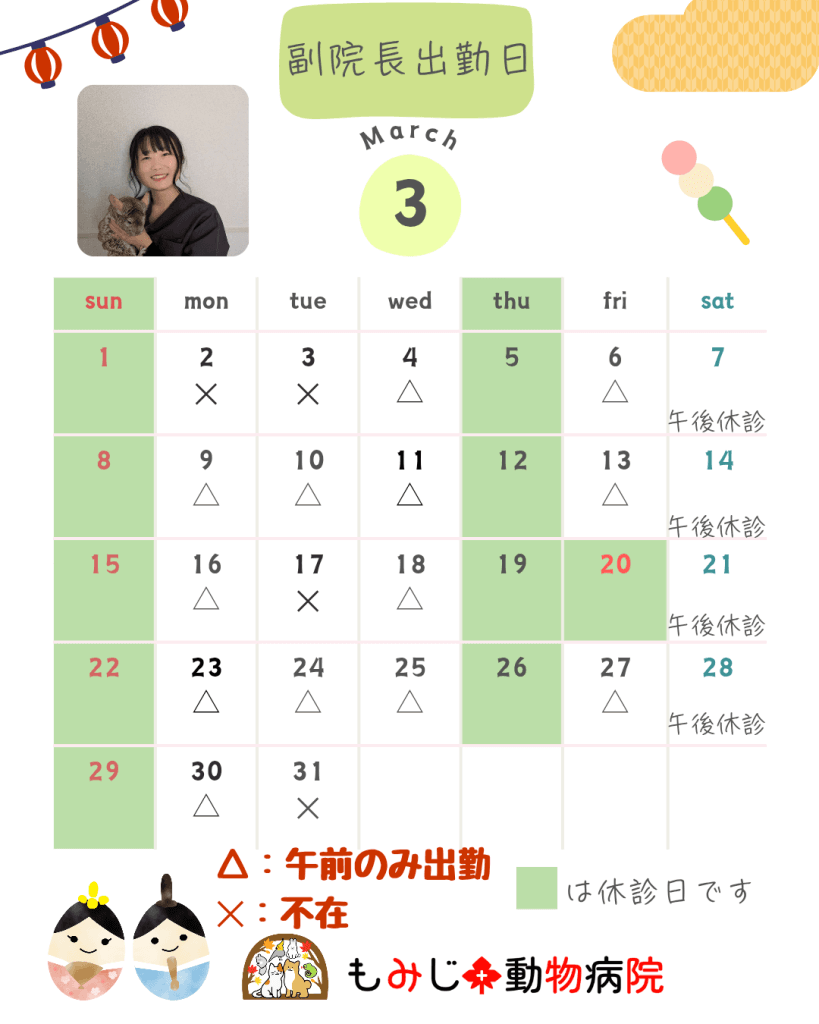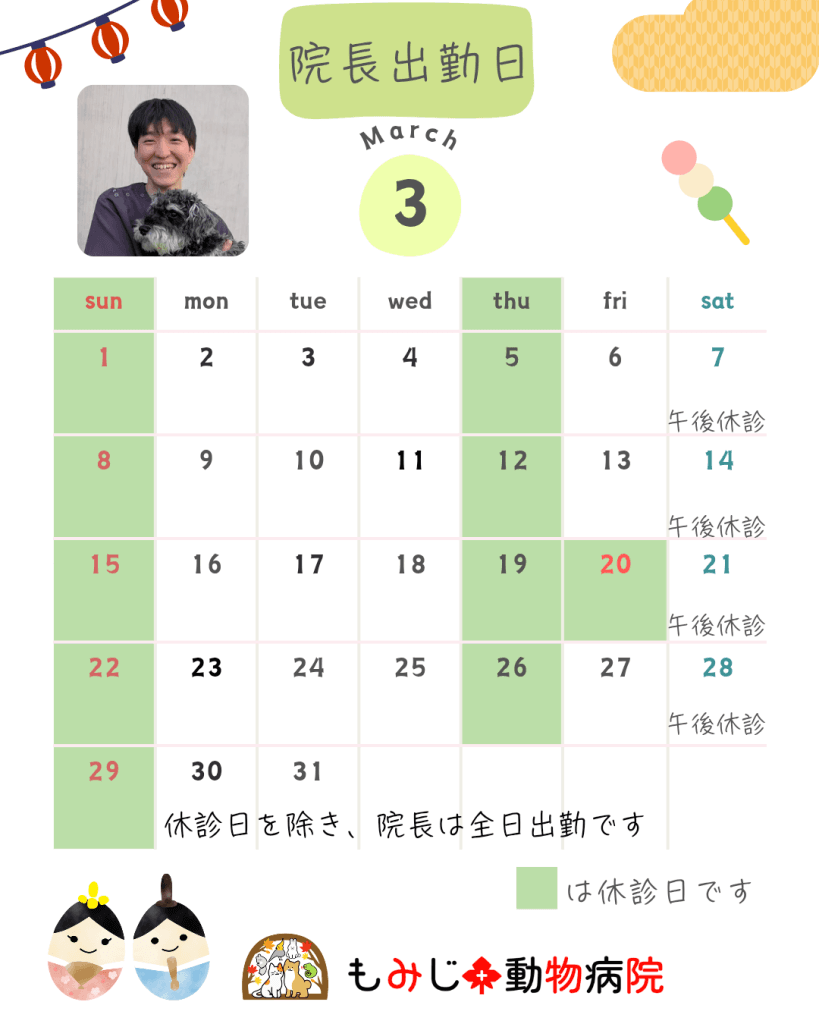 こんにちは。遅くなりましたが、3月の獣医師出勤スケジュールです。