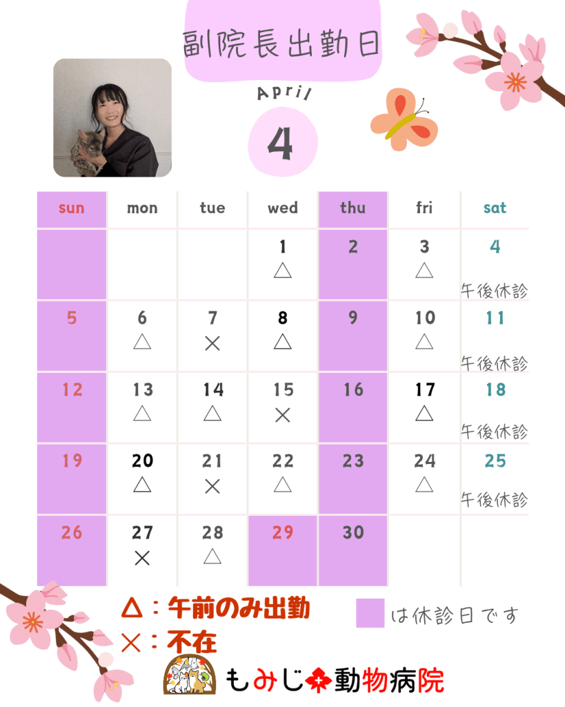 4月の獣医師出勤表 2026年3月29日 最終更新日時 : 2026年3月29日 momijiこんにちは!もみじ動物病院です🍁4月の獣医師出勤スケジュールです!急遽休診になる場合があります🙇その際はホームページ、インスタグラムでお知らせしますので、ご確認のうえご来院いただけますと幸いです。