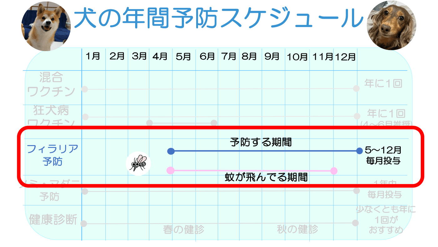 フィラリア症は一度感染すると治療するのは非常に困難ですが、薬をきちんと投与すればほぼ100%予防が可能な病気です。ですので、予防薬の投与がとても重要になります。フィラリアは蚊によって媒介されるため、予防薬を投与する期間はおよそ、「蚊を見かけ始めた時期から見かけなくなった次の月まで」です。すなわち、地域にもよりますが「5月から12月まで」の予防を推奨しています。