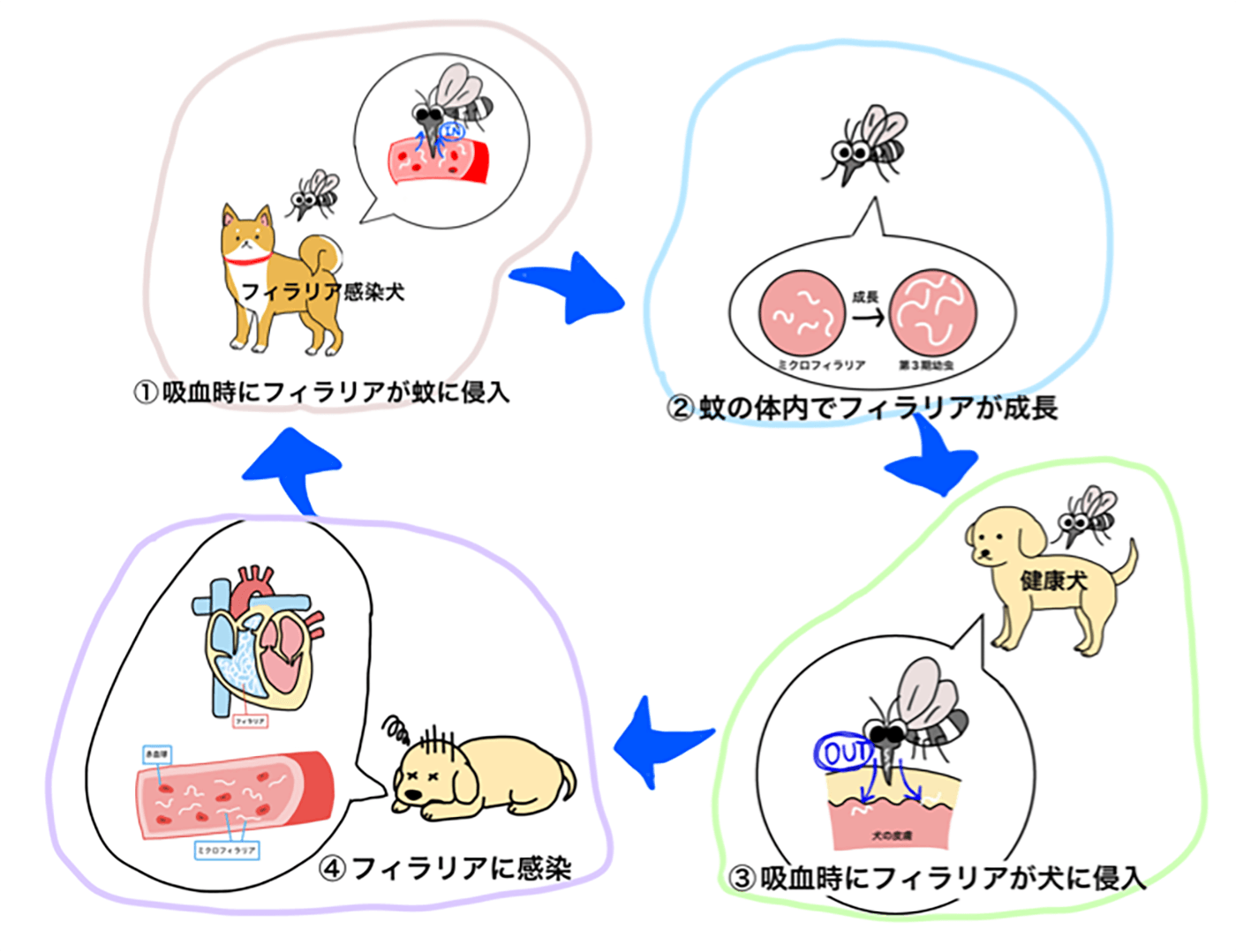 フィラリアは、「蚊」に刺されることで感染します。トウゴウヤブカやアカイエカなどの蚊がフィラリアに感染した犬を吸血すると、感染犬の血液中に存在する、ミクロフィラリアというフィラリアの幼虫が蚊の体内に取り込まれます。取り込まれたミクロフィラリアは、蚊の体内で2回脱皮して、他の動物への感染力を持った第3期幼虫に成長します。第3期幼虫は蚊の吸血針で待機し、他の動物の吸血時に刺し傷から体内に入ることで感染が成立します。